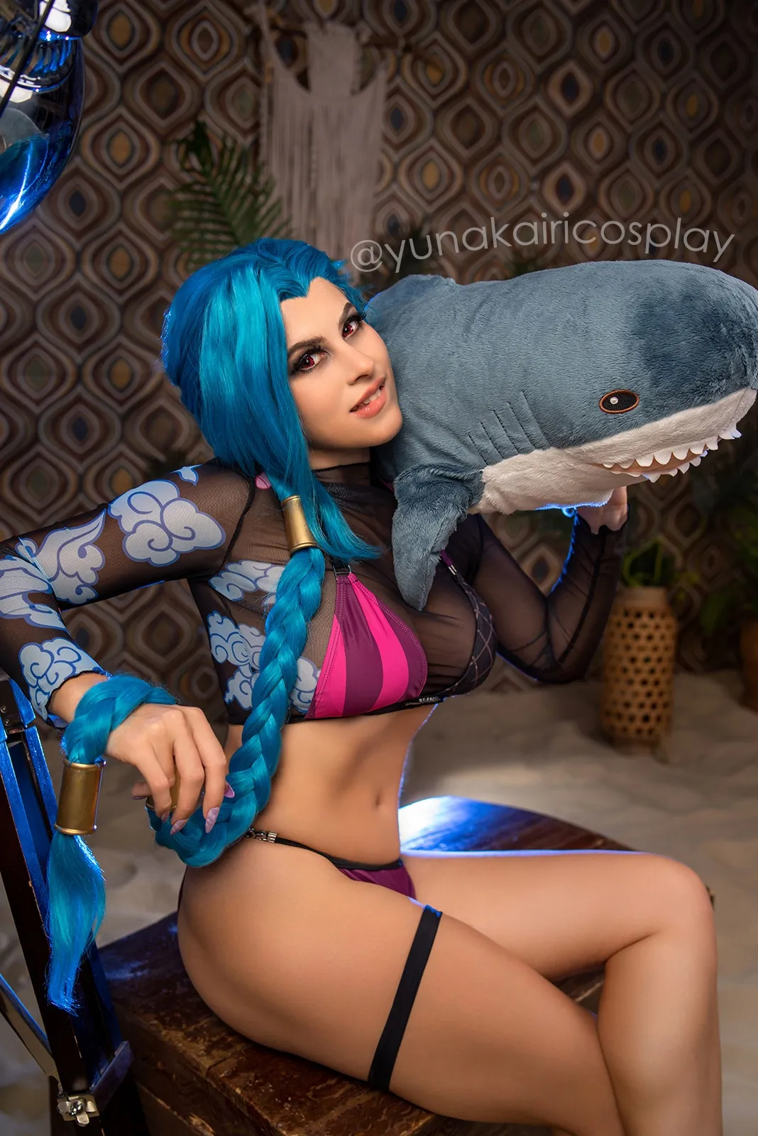 Yuna Kairi allowed herself to change the image of Jinx: in the official materials on the universe heroine is unlikely to laze in the sand or pose in candid poses, she would rather think through a plan to blow up the photo studio. The model turned the character’s classic outfit into a fashionable swimsuit. In addition, the physique of the original Jinx differs from that of Yuna Kairi – the heroine of “Arcane” has a more modest bust and hips.